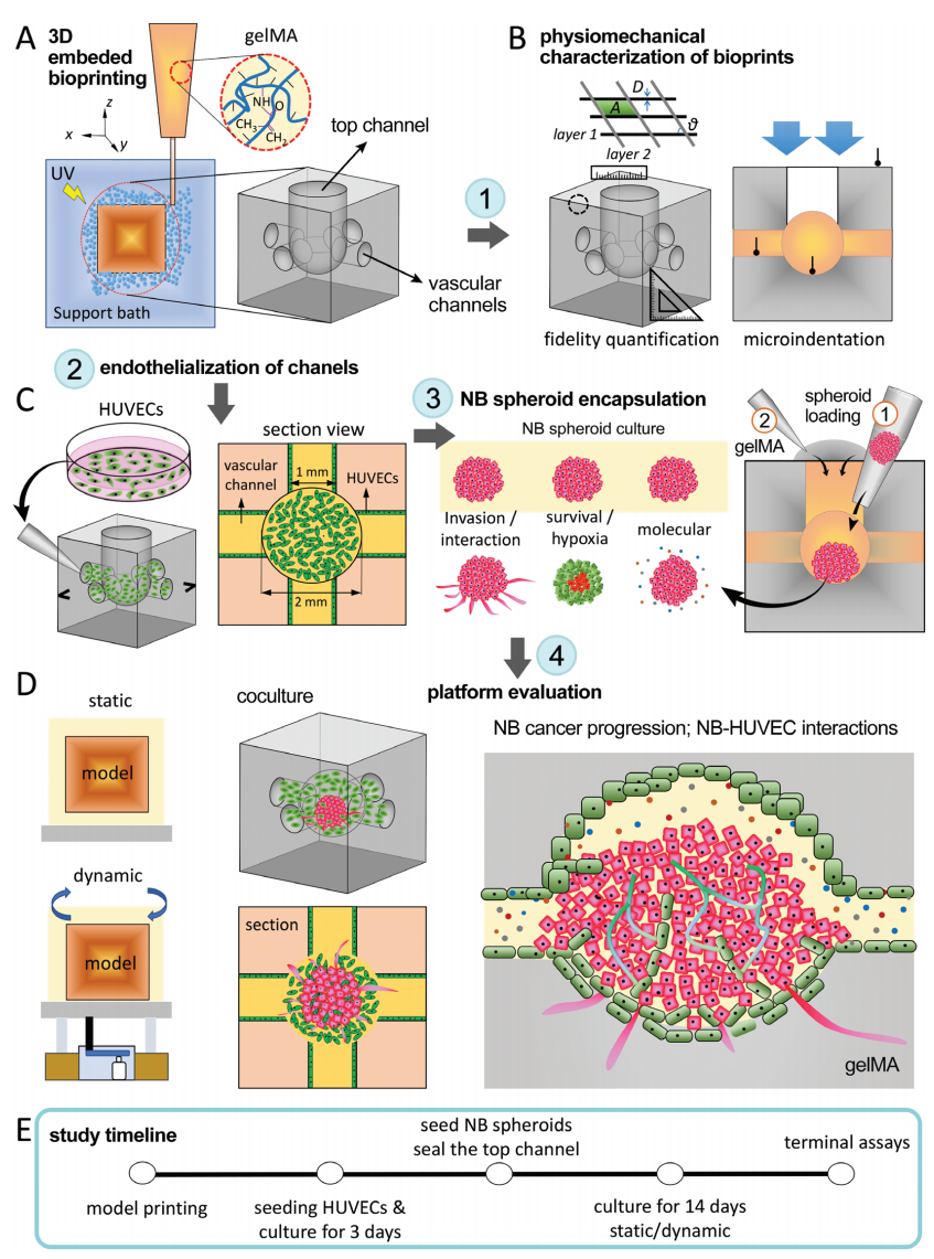 本研究中,作者利用3D嵌入式生物打印方法,将NB球状体和HUVECs打印在预定的血管组织几何形状中,用于研究NB肿瘤的进展和与内皮的相互作用(图1)。