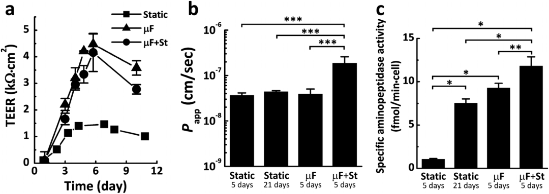 通过在微通道上以低速率流动液体,产生低剪切应力,并施加周期性应力,模拟生理性蠕动,作者重建了肠道微环境。在这些条件下,柱状上皮细胞迅速分化,自发地生长成褶皱,再现了肠绒毛的结构,并形成了对小分子的高完整性屏障,比在静态Transwell模型中培养的细胞更好地模拟整个肠道。