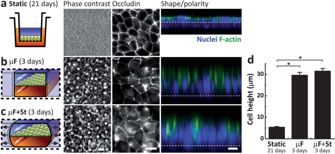 为了探索模拟肠道物理微环境的生理意义,Caco-2细胞在没有液体流动和机械应变的静态Transwell室(图3a)或在只有单独流动(图3b)或流动加循环机械应变(图3c)的肠道芯片微流控装置中生长。