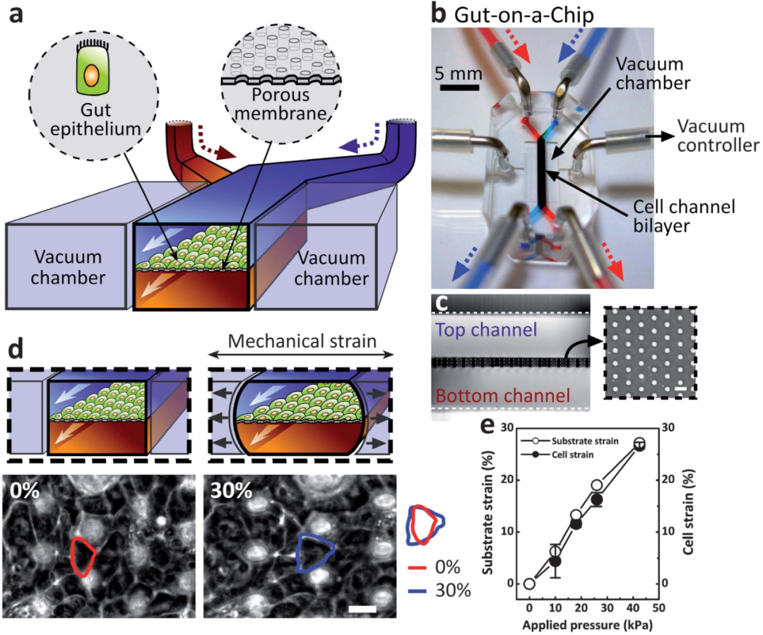 微系统设计包含了两层紧密相接的微流控通道,通道之间由一个薄的多孔膜隔开,膜上涂有细胞外基质(ECM),并且其内壁上覆盖有人类Caco-2肠上皮细胞(见图1a)。为了使上皮细胞单层产生类似于人类肠道蠕动所引起的有节奏的机械变形,由计算机控制的真空管道调节的循环吸力被施加到位于微通道两侧的全高空的真空室中,以反复拉伸和放松弹性的ECM涂层多孔膜(图1d)。
