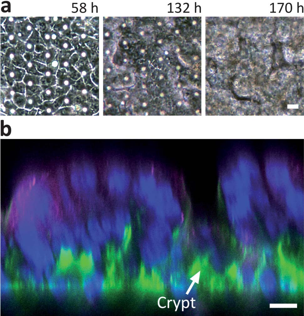 当Caco-2细胞在有流动和循环应变的肠道芯片微装置中培养更长的时间时,作者发现原本平面的柱状上皮细胞自发地生长,形成起伏和褶皱(图4a)。当用免疫荧光共聚焦显微镜分析垂直切面时,发现这些褶皱呈现出正常肠绒毛的形态,其内衬是具有基底核的极化柱状上皮细胞,并由隐窝分隔(图4b)。