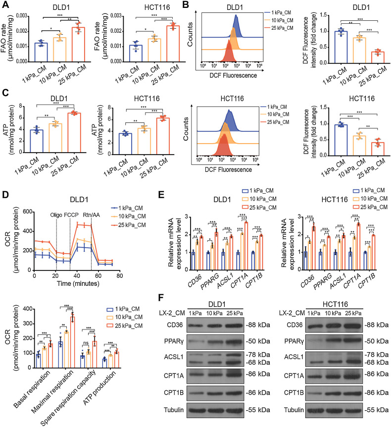 以上数据表明,肿瘤微环境中可能存在中介。活化的肝星状细胞充当成纤维细胞,产生 ECM 蛋白,并在肝纤维化中发挥关键作用。作者假设 HSC 与诱导代谢重编程的机械线索有关。对HSCs和结肠癌细胞进行了混合培养实验,发现FAO通路中FAO速率和关键基因的表达与硬度成比例增加,同时活性氧(ROS)水平降低。因此作者推断,在HSC存在的情况下,结肠癌细胞在暴露于坚硬的基质后会重新编程FAO代谢。并且肝脏僵硬可激活 HSC 分化为肌成纤维细胞,而脂滴丢失是HSC 活化的特征。研究发现基质硬度驱动了更多脂肪酸从HSC中转移。这些数据提供了 HSC 和肿瘤细胞之间瘤内代谢串扰的证据,这些串扰被 ECM 硬化激活。