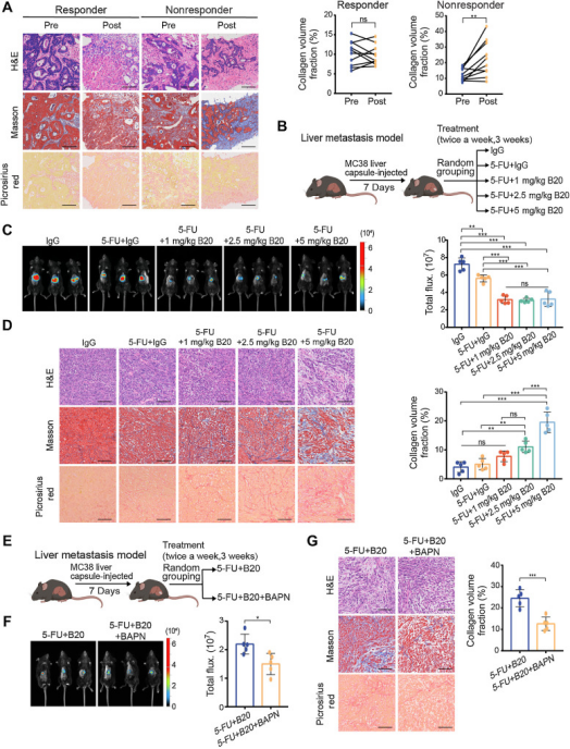 作者首先对20例接受贝伐珠单抗联合治疗的CRC患者的肝转移灶配对样本(包括10例应答者和10例无应答者)治疗前后的评估表明,抗血管生成治疗后,与应答者相比,无应答者的肝转移灶中ECM沉积和高度激活的脂肪酸氧化( FAO )途径升高。并且体内实验表明贝伐珠单抗以剂量依赖性方式增加肝转移瘤中的ECM沉积。为了进一步验证 VEGF 靶向治疗后 ECM 沉积的可能影响,作者将 5-FU 和 B20 与已知的赖氨酰氧化酶药物抑制剂 β-氨基脘腈 (BAPN) 联合使用,以降低肝 mCRC 小鼠模型中的 ECM 硬化。结果发现BAPN抑制机械转导可防止肿瘤进展,减少ECM沉积,并进一步提高了抗血管生成治疗的疗效。