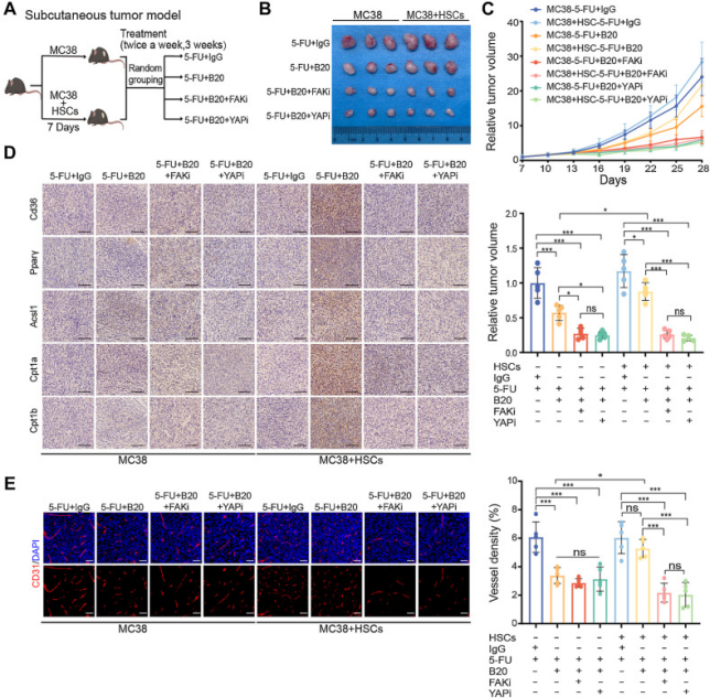 转移性结直肠癌(mCRC)患者的生存机会相当低,肝转移也是导致死亡的主要原因。抗VEGF抗体贝伐单抗联合化疗是目前基于OS改善的mCRC的标准治疗方法。然而,肝转移瘤的组织硬度高于原发结直肠肿瘤,这是由高度激活的转移相关成纤维细胞引起的,导致血管生成增强和抗血管生成治疗抵抗,因此贝伐珠单抗耐药性是治疗转移性结直肠癌的主要挑战之一。