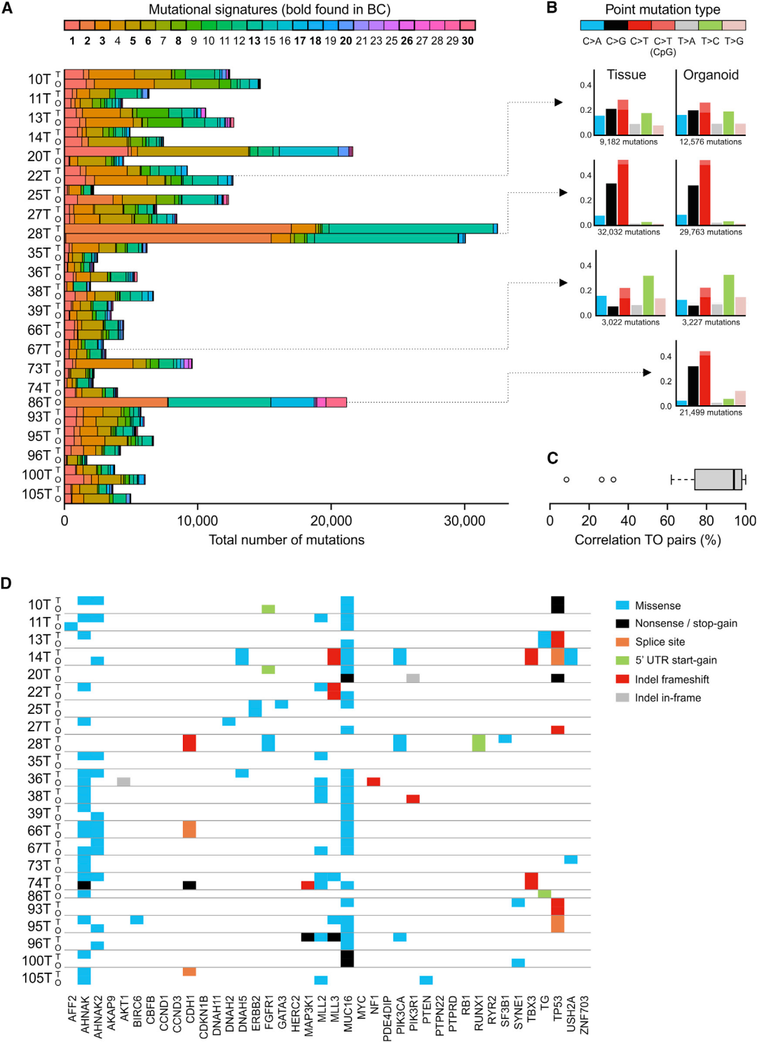 作者用数学方法分析了BCs和类器官中的碱基替换,并绘制了每个患者的每个突变特征的突变总数(图4A)。与患者之间的异质性相反,突变量和突变类型在匹配的BC-类器官对中大部分是相同的(图4A-4C)。