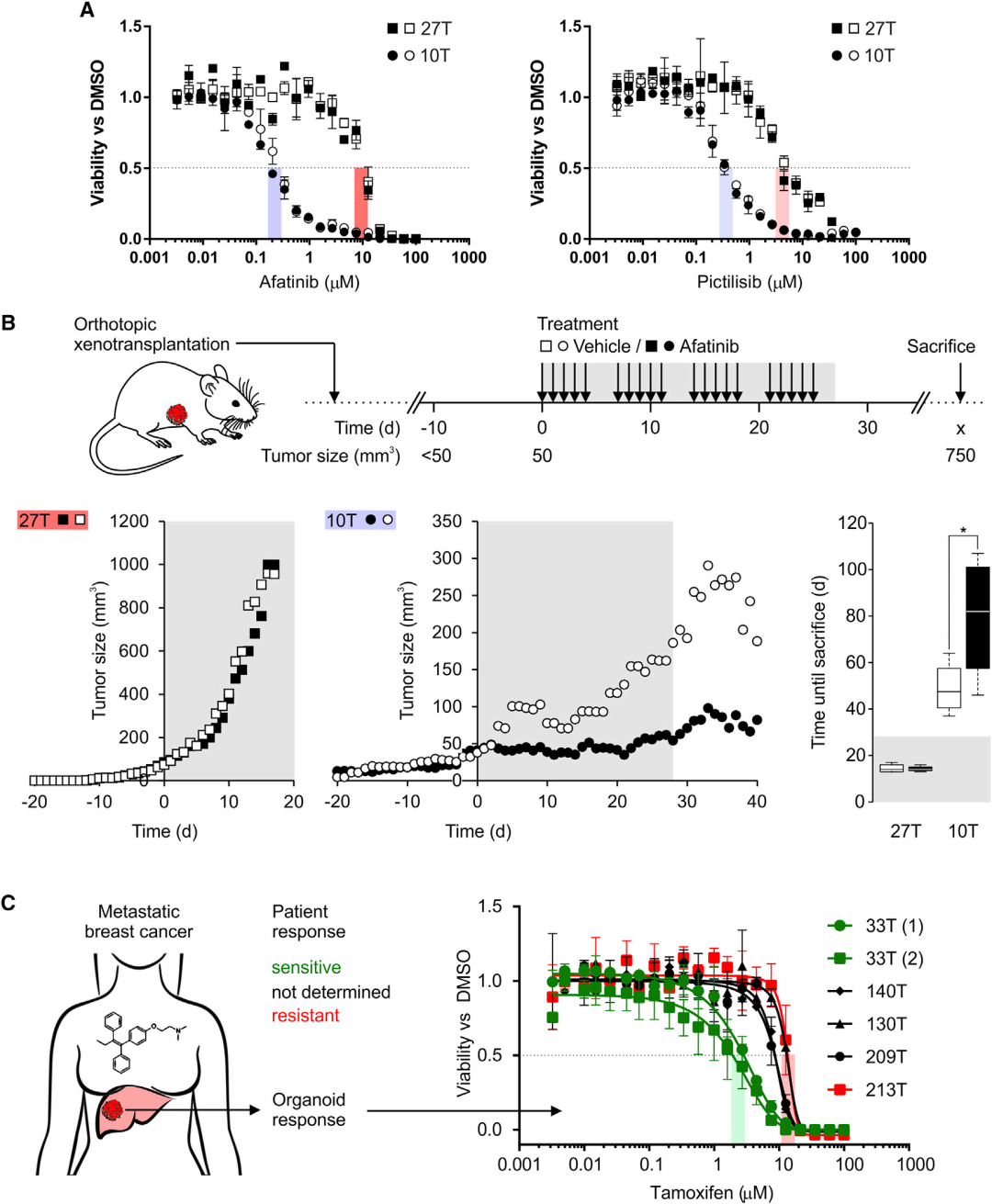 为了比较体外和体内的药物反应,作者首先选择了两个对体外阻断HER信号的药物有不同反应的BC类器官系(图7A),并将每一系的细胞移植到10只小鼠的双侧。一旦肿瘤生长超过50立方毫米,相应的小鼠将接受10毫克/克体重的阿法替尼或安慰剂治疗28天(图7B)。有阿法替尼抗性的BC类器官系27T,在接受阿法替尼和安慰剂治疗时,肿瘤生长速度几乎相同(图7B)。对阿法替尼敏感的类器官系10T,在接受阿法替尼治疗时的生长速度明显慢于安慰剂组(图7B)。携带27T肿瘤的小鼠需要在同一时间处死,而携带10T肿瘤的小鼠在接受阿法替尼治疗时,与安慰剂相比寿命明显延长(图7B),再现了各自的体外药物反应。BC类器官对他莫西芬的体外反应与各自患者的反应一致(图7C),表明BC类器官有潜力代替体内模型作为药物预测工具。