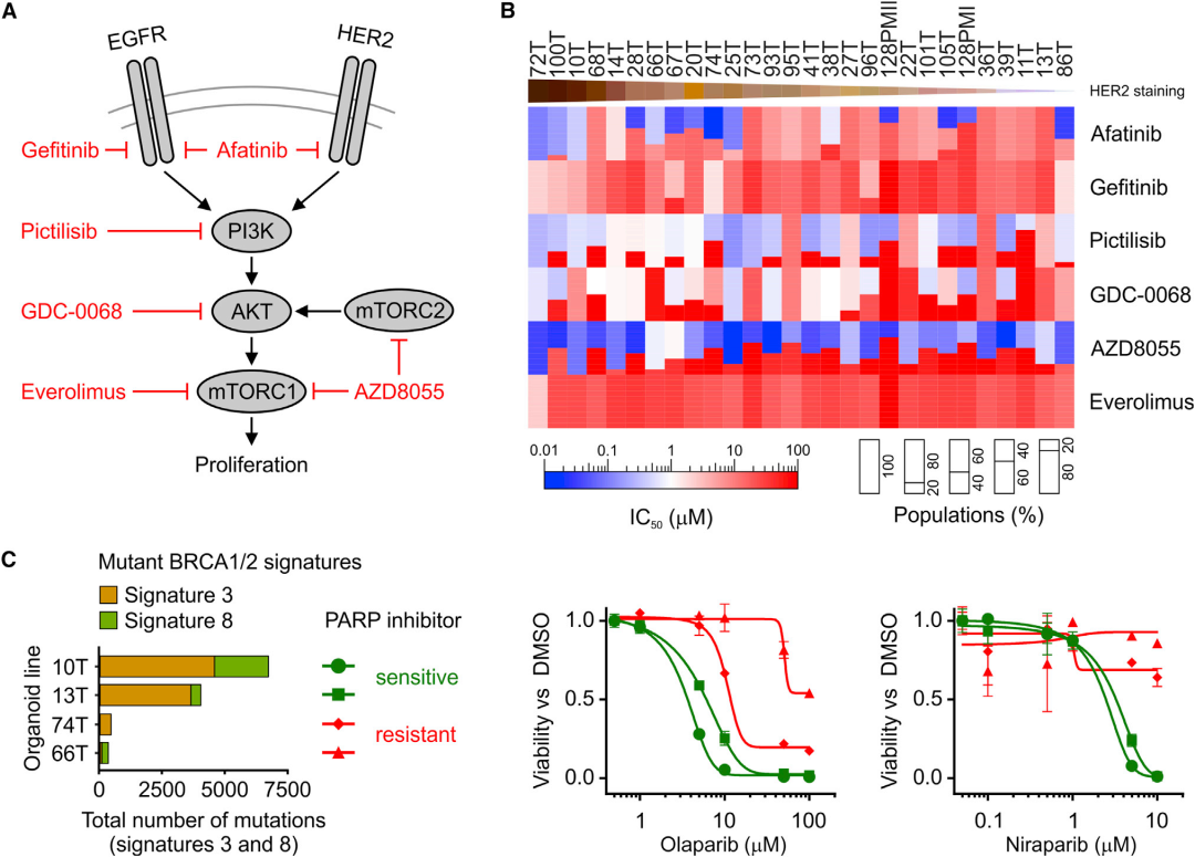 作者对BC类器官使用了针对HER信号通路的药物(图6A),并进行了细胞活力测定。通过检测每种药物21个浓度获得剂量反应曲线,并确定了各药物的IC50(图6B和6C)。作者发现了几个相对的IC50值,表明存在不同的易感类器官亚群(图6B)。具有高BRCA1/2特征的BC类器官对PARPi敏感,而具有低BRCA1/2特征的BC类器官却不敏感(图6C)。