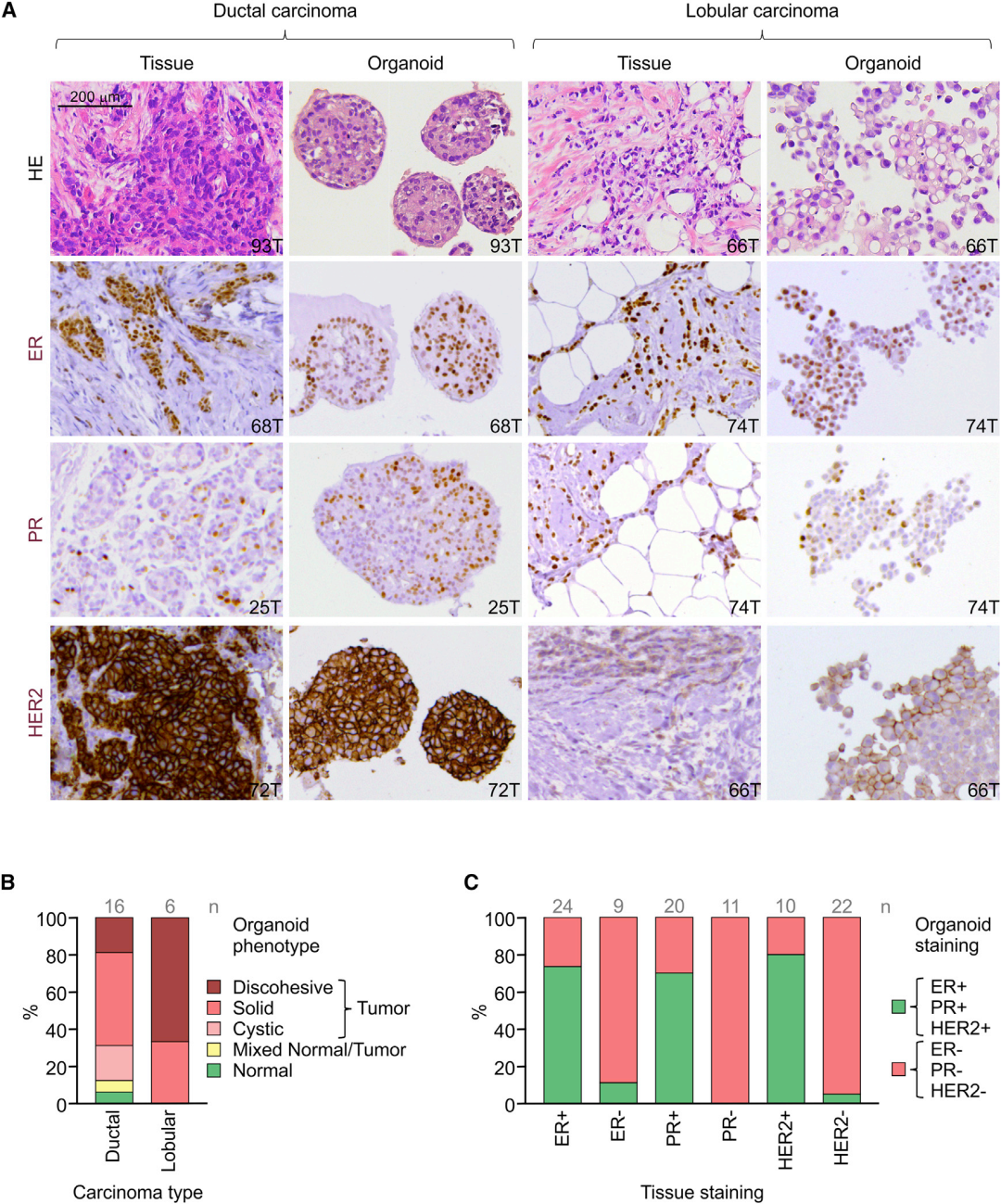 研究中使用的BC样本和其对应的类器官显示出类似的亚型分布(图1B)。BC类器官的表型与原始BC一致(图2)。例如,导管癌一般产生固体的、连贯的类器官,而小叶癌主要产生盘状的类器官(图2)。80%的HER2阳性和大于90%的HER2阴性BC类器官和原始BC的HER2状态一致(图2)。