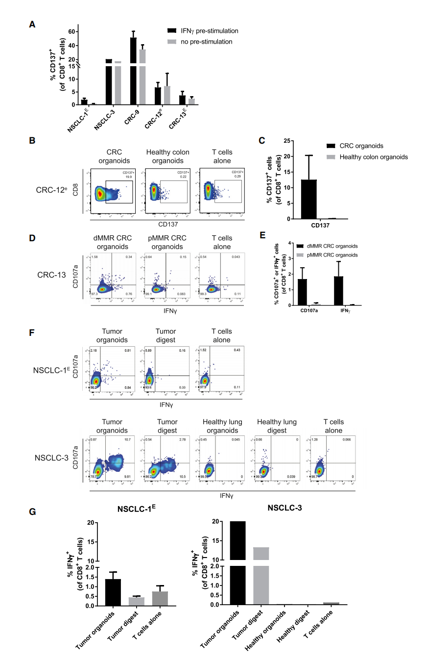 为了评估肿瘤类器官反应性T细胞对IFN-γ的依赖性,作者比较了用IFN-γ预刺激或不处理的肿瘤类器官刺激后的T细胞对活化标志物CD137的表达(图4A)。T细胞反应性仅存在于与外周血淋巴细胞共培养2周后诱发反应性的肿瘤类器官中;正常组织或pMMR CRC类器官中没有观察到T细胞反应性(图4B-4G)。