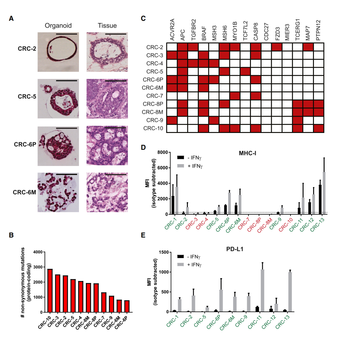 类器官在形态上反映了它们源于的原始肿瘤(图1A)。肿瘤类器官的WES显示了高突变负担,符合在先前报告的高突变CRC的特征(图1B)。考虑到MHCⅠ类的丧失在高达60%的dMMR CRC中发生,作者筛选了用IFN- γ刺激后的MHCⅠ类表达,并从62%的类器官样本中发现了9个MHCⅠ类缺陷的肿瘤类器官(图1D)。