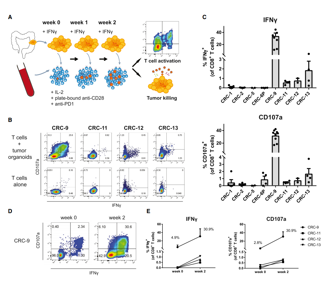 在8名拥有MHC I类+肿瘤类器官的患者中,有4名在共培养2周后,用自体肿瘤类器官的刺激同时诱导了IFN-γ的分泌和CD107a的上调(图2B和2C)。来自CRC-9患者的CD8+T细胞的很大一部分已经具有肿瘤反应性,并且在共培养2周后,这一群体的频率增加了约10倍(图2D和2E)。相反,来自CRC-11、CRC-12和CRC-13患者的T细胞在类器官共培养前没有显示出任何可检测到的肿瘤反应性(图2E),表明T细胞类器官共培养系统也可用于扩大以前检测不到的肿瘤反应性T细胞群。