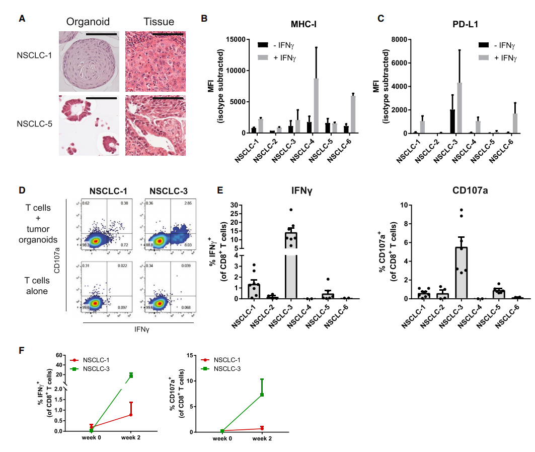 作者从6名患者中生成了NSCLC类器官(图3A)。所有的NSCLC类器官都具有MHC I类功能,并在IFN-γ的刺激下表达不同水平的PD-L1(图3B和3C)。在体外将外周血单核细胞(PBMCs)暴露于自体肿瘤类器官中共培养2周后,两名患者的肿瘤反应性CD8+群体扩大(图3D和3E)。在与类器官共培养之前,这些反应都不能被持续检测到(图3F)。