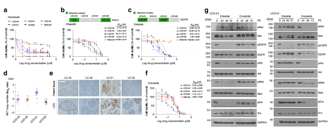 与靶向药物Olaparib、Erlotinib和Crizotinib相比,NBO对细胞毒性药物多西他赛的敏感性显著更高(图6)。由于LCOs源于未用药患者的癌症组织,作者推测样本LCO-51对厄洛替尼的耐药性可能与其组织内在的抗性机制有关。根据基因组数据的拷贝数分析,LCO-51具有MET的扩增,这与对EGFR酪氨酸激酶抑制剂的耐药性有关(图6d)。