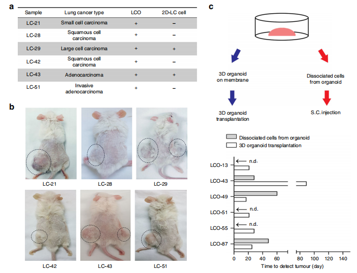 作者将2D细胞与LCO植入小鼠体内。6个2D培养细胞中只有2个产生了肿瘤(图5a, b),而所有移植的LCOs都在小鼠体内产生了肿瘤,且肿瘤更大、时间更短,(图5c)。