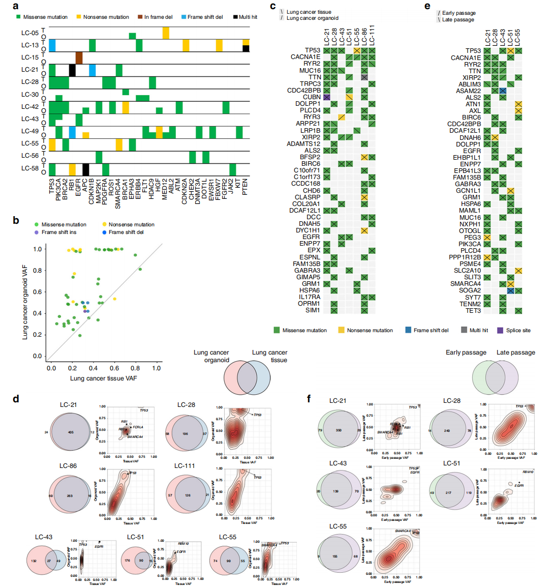 LCOs也保留了对应肺癌组织中的大多数体细胞突变,SNP基因分型的一致性为100%。LCOs保留了大多数变异,包括其原始癌症组织的驱动突变。这些类器官中的变异等位基因分频率(VAF)分布通常保持了原始癌症组织中的VAF分布(图3d)。有3个病例中类器官中的突变数量显示多于原始组织,类器官的特异性突变很可能以较低的频率存在于原发肿瘤中,而不是真正的新突变,因为原发肿瘤组织含有的正常细胞降低了VAF(图3d)。类器官中突变的数量在后来的代次中有所增加,这可能由亚克隆扩展导致(图3f)。