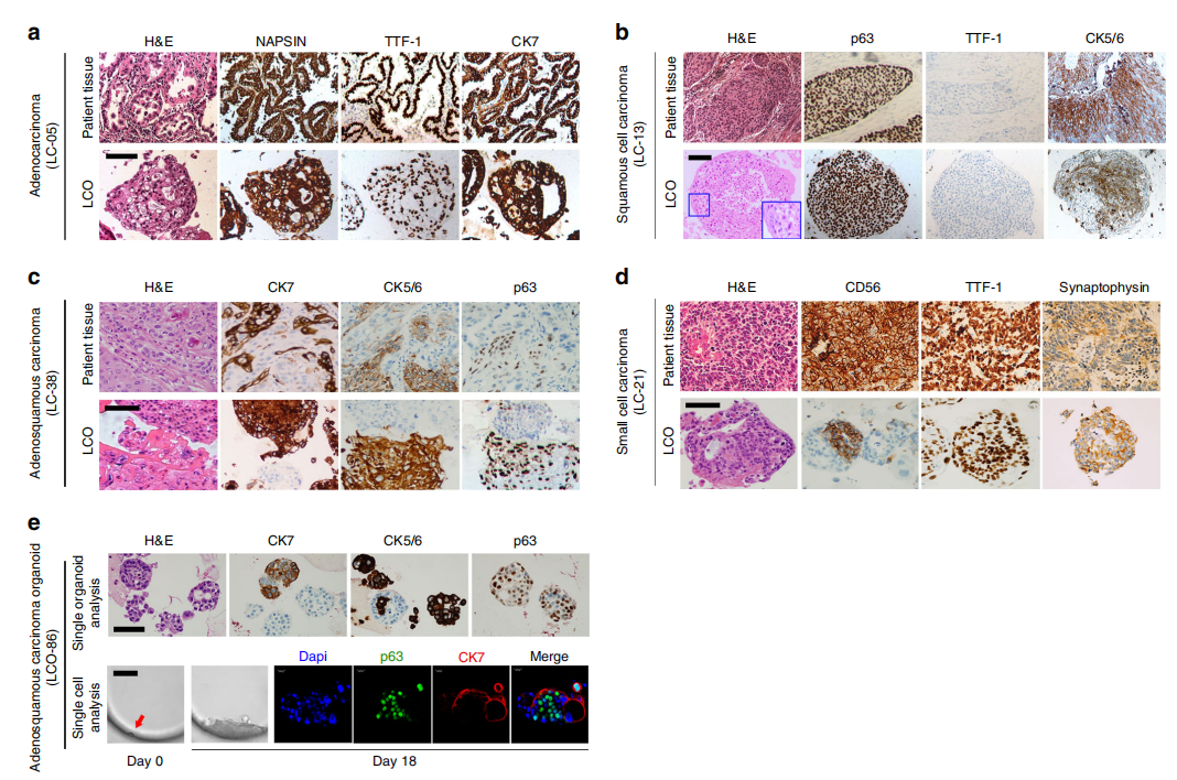 与其亲本癌组织相似,源自腺癌的LCOs产生腺泡状或大腺状结构,并保留肺腺癌标志物napsin-A、TTF1和CK7的表达(图2a)。腺鳞状LCOs保留了原始患者肿瘤组织中看到的腺癌和鳞状细胞癌的混合组织学特征。它们还再现了原始癌症组织的标记物表达模式(图2c)。单细胞分析显示类器官结构似乎是由腺癌和鳞癌成分组成(图2e)。小细胞肺癌类器官显示出典型的小细胞形态,即密集的小圆形肿瘤细胞,细胞质稀少,细胞核呈颗粒状。在相应的癌症组织中观测到小细胞癌的诊断标志物的表达(图2d)。