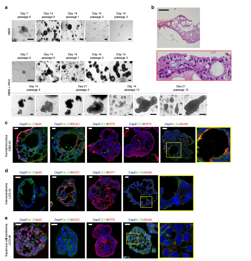 作者通过调整培养基,成功实现支气管细胞在10次传代后都能够成功形成NBO(图4a)。NBO从第4次传代开始出现了出芽的小管状类器官,并在随后的10次传代的中长期保持这种形态(图4a)。H&E数据显示,NBO具有由基底细胞和管腔细胞组成的假层上皮,包括分泌细胞和纤毛细胞,如同正常的支气管粘膜组织(图4b)。NBOs中的细胞类型分布与LCOs中的不同。