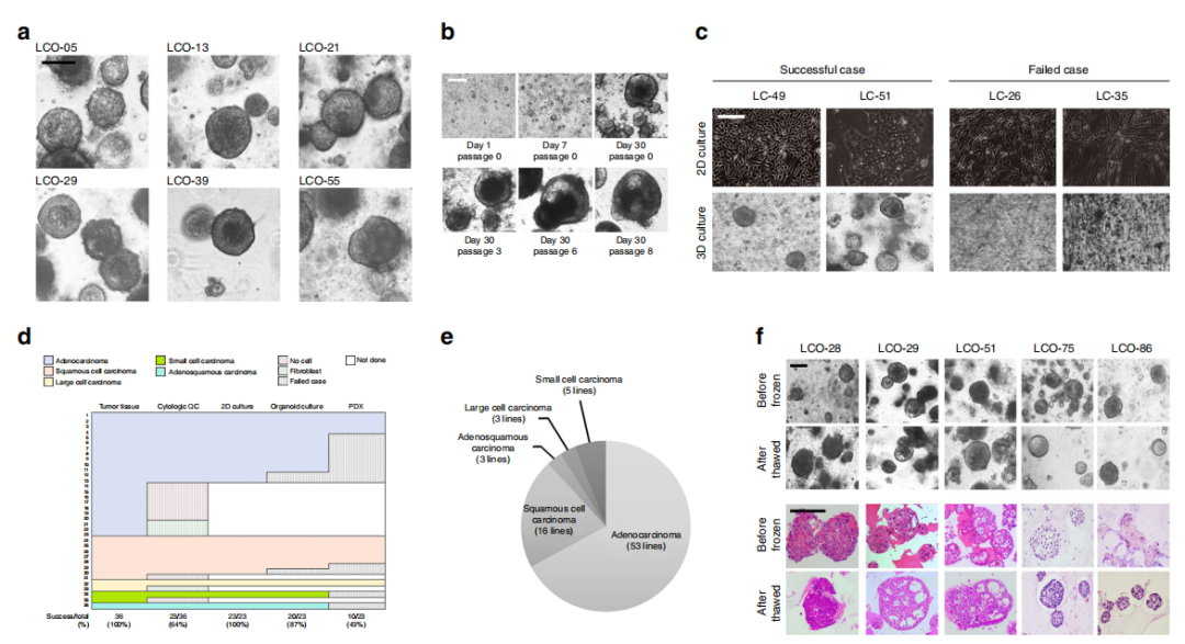 LCOs经过6个月的长期扩增培养,球状的类器官形态没有变化,并保持了增殖能力(图1b)。有23个样本成功建立了2D培养模型,20个样本成功生成了LCOs,10个样本成功生成了源于患者的异种移植模型(PDXs)(图1d)。在不同的肺癌亚型中,类器官培养的成功率没有差异(图1d)。作者对生物样本库中冷冻保存的类器官进行了复苏试验。使用3D培养方法,56个LCOs中有39个(70%)成功重现了原始组织的类器官形态和组织学特征(图1f)。
