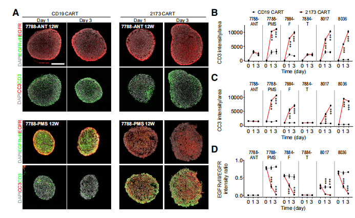 作者测试了CAR-T细胞与6个GBO样本的共培养,包括含有高和低EGFRvIII+细胞百分比的GBO,以及两对来自肿瘤亚区采样的GBO,其中一个亚区含有高百分比的EGFRvIII+细胞,另一个亚区没有),并通过免疫染色证实(图7A 和S7A )。CD19和2173BBz CAR-T细胞都侵入了所有的GBO,但只有当2173BBz CAR-T细胞与EGFRvIII+的GBO共培养时,才观察到CAR-T细胞的明显扩增图7A和S7A)。CD3+T细胞明显增加。这种CAR-T细胞扩增的增加,伴随着Caspase-3信号的增加和GBO中EGFRvIII/EGFR信号强度比例的降低(图7A、7C和7D),表明EGFRvIII+细胞被2173BBz CAR-T细胞锁定并杀死。许多EGFR+ EGFRvIII的肿瘤细胞在加入CART的3天后仍然存在(图7A和S7A),表明2173Bbz CAR-T细胞虽然对其目标有很强的特异性,在此实验的条件下无法完全根除所有肿瘤细胞。
