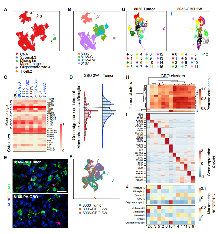 在单细胞水平上,由拷贝数改变(CNA)状态和标记基因表达(图S4A)确定的来自亲本肿瘤和衍生GBO的肿瘤细胞表现出患者特有的聚类,而来自不同患者的非肿瘤细胞类型如巨噬细胞/微胶质细胞、T细胞、基质细胞和髓鞘少突胶质细胞则聚在一起(图4A和4B)。巨噬/小胶质细胞在2周时在亲本肿瘤和GBO中表现出类似的许多免疫相关基因的表达。这表明肿瘤微环境的某些特征在GBO中得以保持(图4C)。作者发现在后来的时间点上,亲本肿瘤和相应的GBO在2周时的细胞分布相似(图4F,S4B和S4G),这表明GBO在培养的延长时间内保持了亲本肿瘤的细胞类型和分子特征。在亲本肿瘤和相应的GBO中,2周后发现了许多不同的细胞簇(图4G、S4C和S4H),反映了细胞类型和细胞状态的多样性。通过对整个转录组基因表达的配对比较,GBO细胞簇与亲本肿瘤细胞簇的相似度很高,表明GBO在很大程度上保持了亲本肿瘤的细胞异质性(图4H、S4D和S4I)。