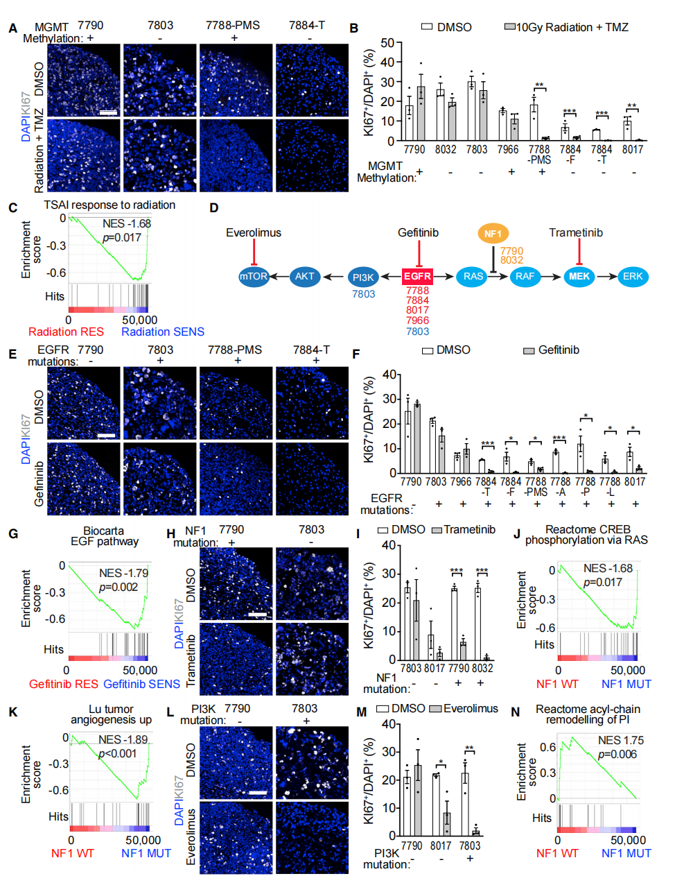 作者没有发现GBO反应和MGMT甲基化之间有明显的关联(图6A和6B)。GBO中KI67+细胞的减少(图6F),表明仅有突变分析而没有功能检测,不足以预测治疗反应。吉非替尼反应者的GSEA富集了与EGF信号和免疫相关的CCR5信号相关的基因组,而吉非替尼耐药组富集了与干细胞相关的神经发育相关的基因组(图6G和S6D;表S6)。作者测试了MEK抑制剂trametinib(1mM)来抑制NF-1下游的信号传导(图6D)。NF1突变体的GSEA富集了与RAS信号传导和血管生成有关的基因组(图6J和6K;表S6),而NF1 WT组富集了与PI3K靶点磷脂酰肌醇的酰基链重塑(图6N)和谷胱甘肽共轭(图S6E;表S6)有关的基因组,这与耐药性有关。作者接下来测试了抑制PI3K诱导的mTOR激活对NF1 WT肿瘤的影响(图6D)。