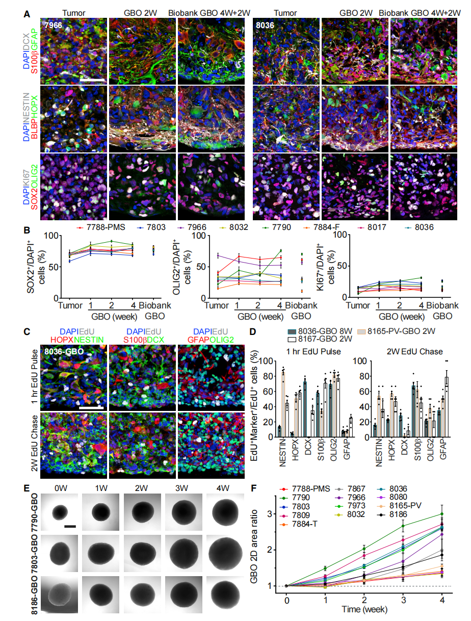 作者观察到GBO中细胞身份和形态的高度异质性,与相应的亲本肿瘤的细胞组成非常相似,表现出明显的肿瘤间异质性(图2A和S1A)。两周后,表达EdU的细胞包括NESTIN+、HOPX+、DCX+、S100B+、OLIG2+和GFAP+细胞,表明通常存在于亲本肿瘤中的不同细胞类型能够持续增殖(图2A和2D)。作者还开发了冻存GBO和从冷冻保存中恢复它们的方法。这些恢复的GBO表现出持续的生长(图2E和2F),各种标记物的表达与它们相应的亲本肿瘤相似(图2A、2B、S1和S2D)。
