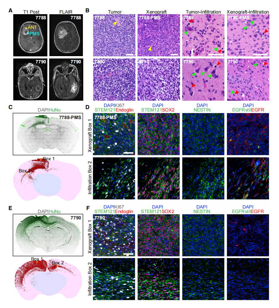 胶质母细胞瘤的一个主要标志是肿瘤细胞向周围脑组织的浸润,这通常与患者MRI扫描的FLAIR信号有关(图5A)。移植后2个月,通过H&E染色和对异种移植的UP-7788-PMS和UP-7790 GBO的分析显示,原始异种移植部位和浸润区域的组织结构与相应的亲本肿瘤相似(图5B)。作者通过人类特异性抗原HuNu和STEM121的免疫组织学证实了GBO衍生细胞的同侧和对侧广泛浸润(图5C-5F)。与胶质母细胞瘤的高血管生成特征相一致,所有异种移植的GBO在移植后2个月都被宿主Endoglin+内皮细胞广泛地血管化(图5D,5F,和S5D;表S5)。在最初的异体移植部位和远处的浸润区域都发现了KI67+增殖细胞和SOX2+或NESTIN+祖细胞群(图5D、5F和S5D)。在作者的模型中,EGFR扩增和EGFRvIII突变体的表达都被来自EGFR扩增和EGFRvIII+肿瘤的GBO保留在异体移植部位和浸润区(图5D和S5D)。