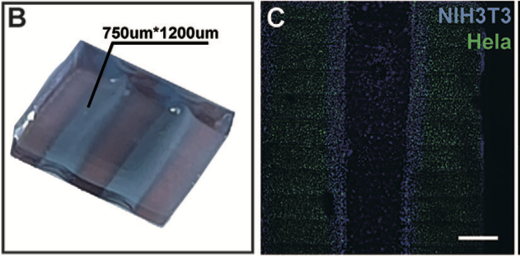 成功制备包含直形与气管状通道的微流体芯片,采用 20 wt% PA 生物墨水(PEGDA:AAm=500%)打印,通道内可灌注不同荧光标记的细胞(如绿色 Hela-GFP 与蓝色 NIH-3T3),形成清晰的细胞分区边界。该芯片通过光固化时间控制(<5 秒)减少细胞光损伤,适用于构建 “肿瘤 - 血管” 互作模型,例如模拟肿瘤细胞通过血管通道的侵袭过程。