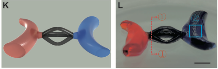K)基于ASTL文件的3D血管网络模型的示意图设计是自然血管系统。它包括多个组件,红色、蓝色和黑色分别表示动脉、静脉和毛细血管,突出了血管结构的详细组织。L)显示多材料3D水凝胶血管网络的实际打印样本的光学图像。它由三个不同的相互连接的段组成:最柔软的段由右侧的红色PA1动脉表示,最坚硬的黑色PA3毛细血管在中间,左侧以蓝色染色的PA2静脉为代表。并指示水凝胶血管网络中相应区域的剖面视图和放大视图。刻度杆:2毫米。(yang et al., 2024)
