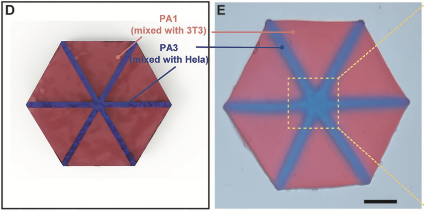 D)基于STL文件的示意图说明了多材料水凝胶的exagon设计,以模拟模拟模拟的肝小叶结构。配置的特点是SAR彩色PA1水凝胶基质,并穿插着蓝色PA3水凝胶通道网络。这些通道在中心收敛到人形“X”图案。E)光学图像显示使用细胞填充PA1和细胞填充PA3生物墨水的实际制造样品,捕获六边形配置。刻度条:2毫米。(yang et al., 2024)
