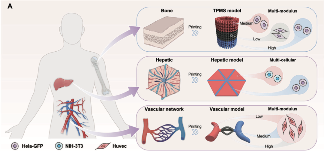 对于骨组织、肝小叶和血管网络的体外建模,使用多材料DLP3D打印制造细胞嵌入水凝胶结构和抑制剂的各种机械特性,确保细胞分布的空间准确性(yang et al., 2024)