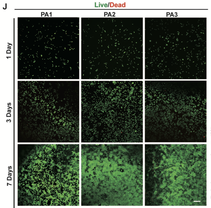 在PA1、PA2和PA3水凝胶(尺寸:π×2mm×2mm×1mm)上培养的NIH-3T3细胞共聚焦显微镜图像,用于活/死染色测定。比例:200μm (yang et al., 2024)