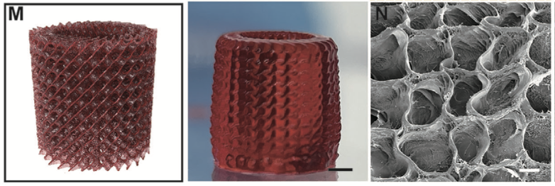M)具有TPMS设计的水凝胶空心管。左侧的图像说明了具有三周期最小表面(TPMS)地形的水凝胶空心管的设计,右侧显示了相应的印刷样品,使用PA2生物油墨准确复制TPMS设计。比例:1mm.N)代表性和详细的扫描电子显微镜(SEM)图像显示了印刷水凝胶空心管表面TPMS图案的微观结构。比例:200微米。(yang et al., 2024)
