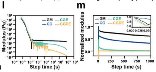 应力松弛测试表明,CGDE 水凝胶在 5% 应变下的残余应力仅为 CGE 水凝胶的 5%,动态响应能力显著优于传统水凝胶。