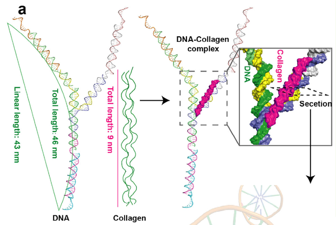 Y形DNA的优化结构,代表GelMA的胶原样肽,以及从HDOCK分子对接获得的DNA/胶原蛋白样肽复合物 (Zhu et al., 2025)