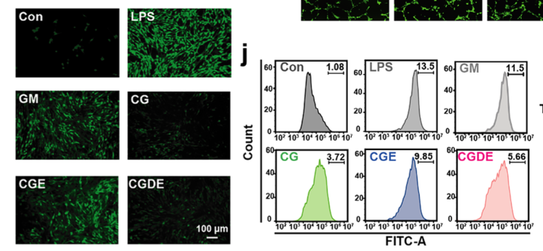 荧光图像显示不同条件下BMSCs的细胞内ROS生成,ROS阳性细胞百分比的流式细胞测量分析,右上角的数字表示ROS阳性细胞的比例 (Zhu et al., 2025)