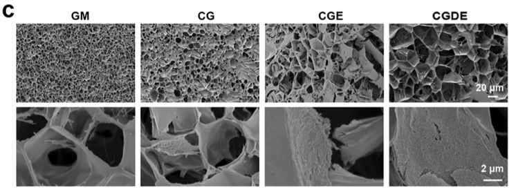 各种放大镜下GM、CG、CGE和CGDE水凝胶的冷冻SEM显微照片 (Zhu et al., 2025)