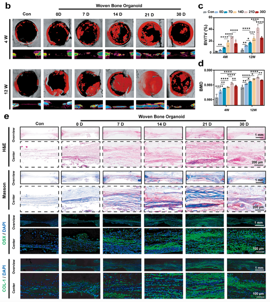阶段 IV(30 天):基质重塑期,部分水凝胶降解,诱导细胞向终末分化,形成类似天然编织骨的无序矿化结构。